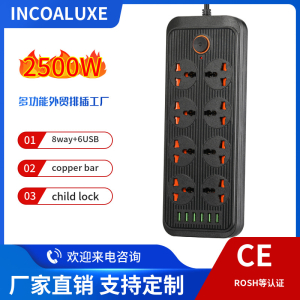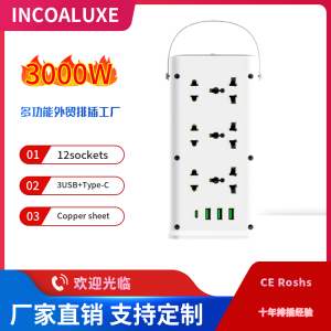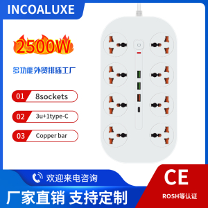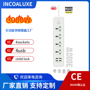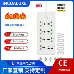 型号:万能孔4位+4USB 3000W 大功率带三米电线2.1A USB材质:ABS五金:全铜电压:220V-250V电流:10A-16A最大功率:3000W排插特点:1.带灯2.带儿童安全保护门设计3.可接浪涌保护(防雷保护)4.可定制线长Product Model: B03Description: Power So......