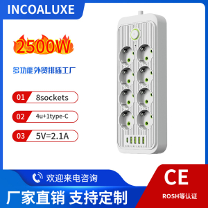型号:欧式8位+4USB+TYPE-C 3000W 大功率带三米电线2.1A USB材质:ABS五金:全铜电压:220V-250V电流:10A-16A最大功率:3000W排插特点:1.带灯2.带儿童安全保护门设计3.可接浪涌保护(防雷保护)4.可定制线长Product Model: D05Description: Eu......